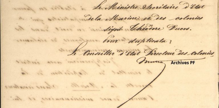 Le 9 mars 1853, le Ministre Secrétaire d’État de la Marine et des Colonies Théodore Ducos répondit à une lettre du Commissaire Impérial aux Îles de la Société, le capitaine de vaisseau Théogène-François Page, également commandant de la Division Navale de l’Océanie.